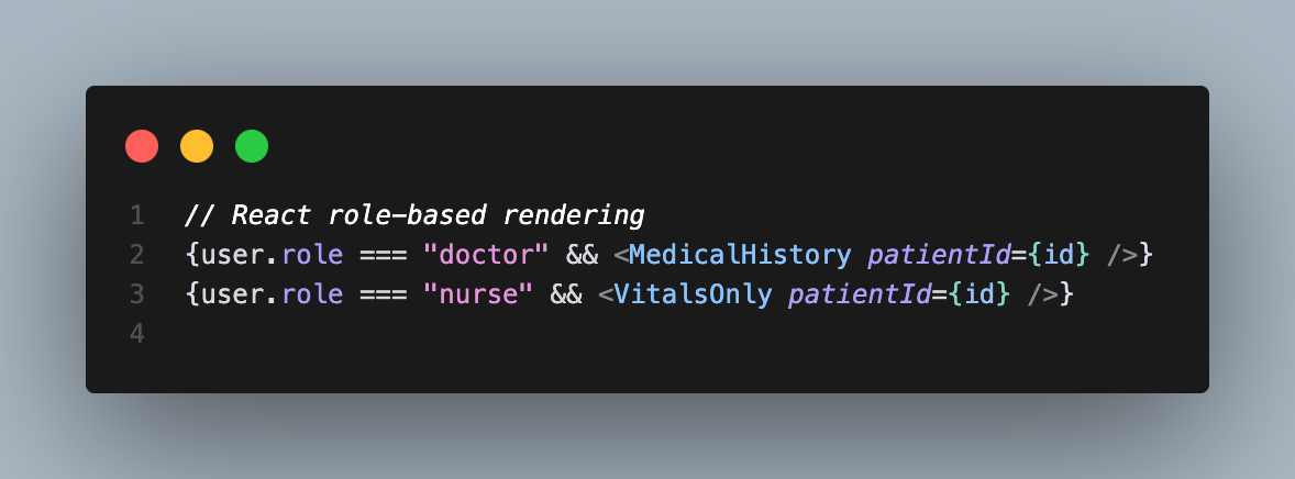Even though backend APIs enforce permissions, your frontend must reflect them too. Show only what the user role allows. This prevents accidental exposure of PHI in the UI an essential safeguard when Building HIPAA-Compliant React Applications.