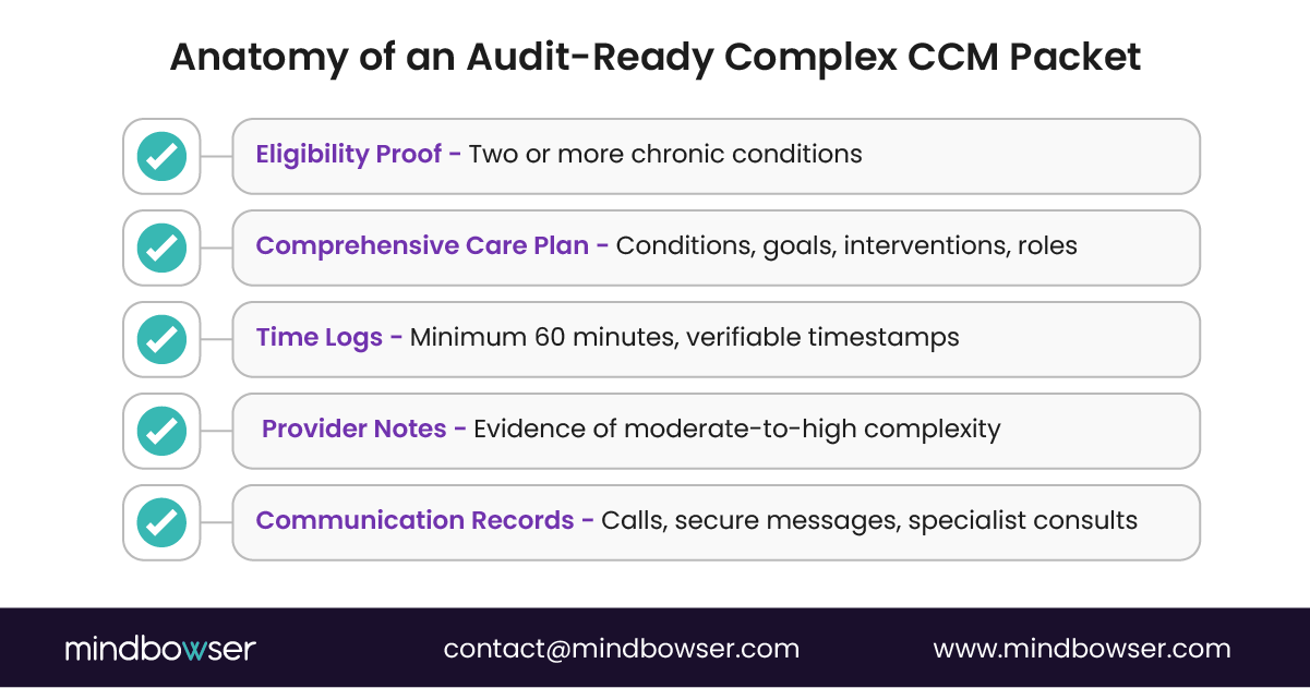 “Process roadmap illustrating stages for Complex CCM success — from patient identification and risk stratification to automation, care plan updates, audit assembly, and QA validation before billing.”