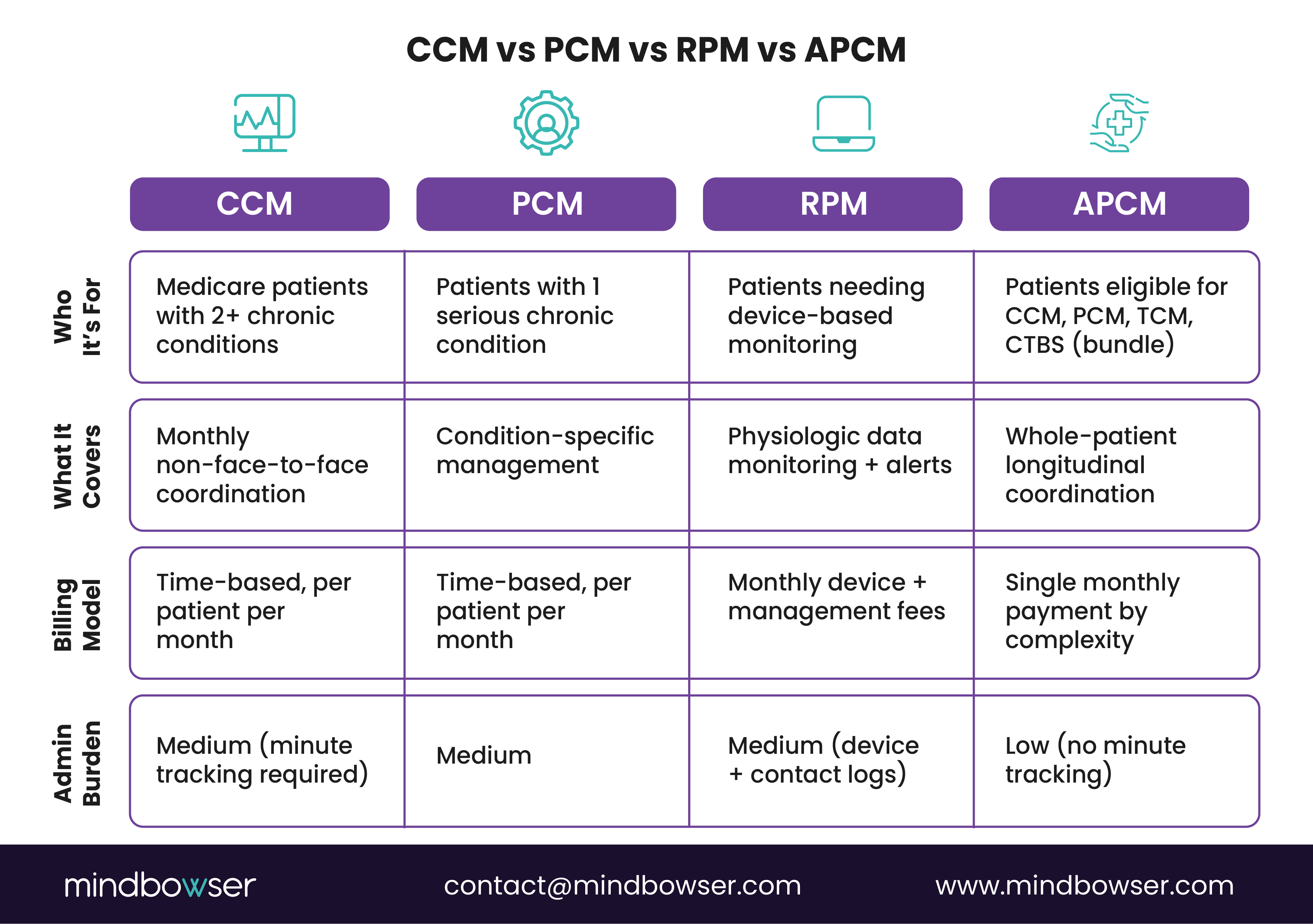 Infographic comparing CCM, PCM, RPM, and APCM models — highlighting differences in chronic condition criteria, care delivery approach, device monitoring, and 2025 bundled payment structure.