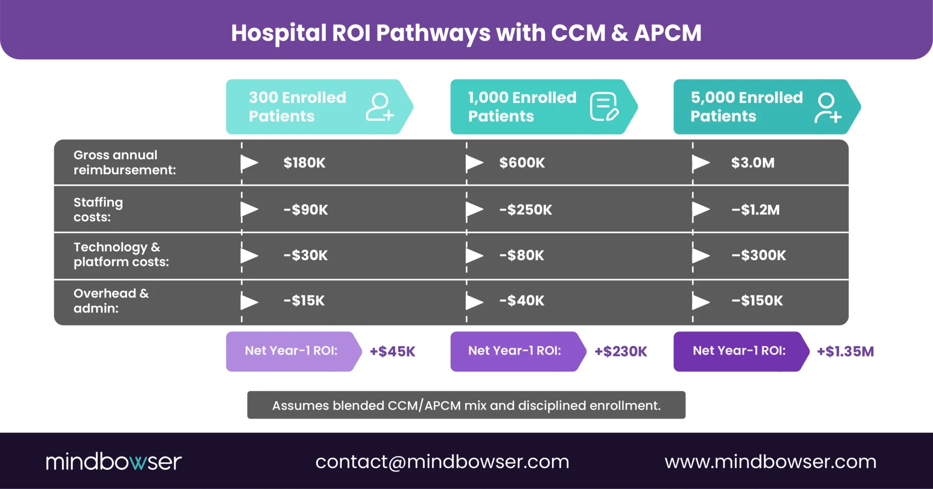 1. Enrollment Rates: A hospital with 1,000 Medicare beneficiaries may find that 600 are eligible for CCM or APCM. Even if only 30% enroll, that still generates 180 monthly claims.