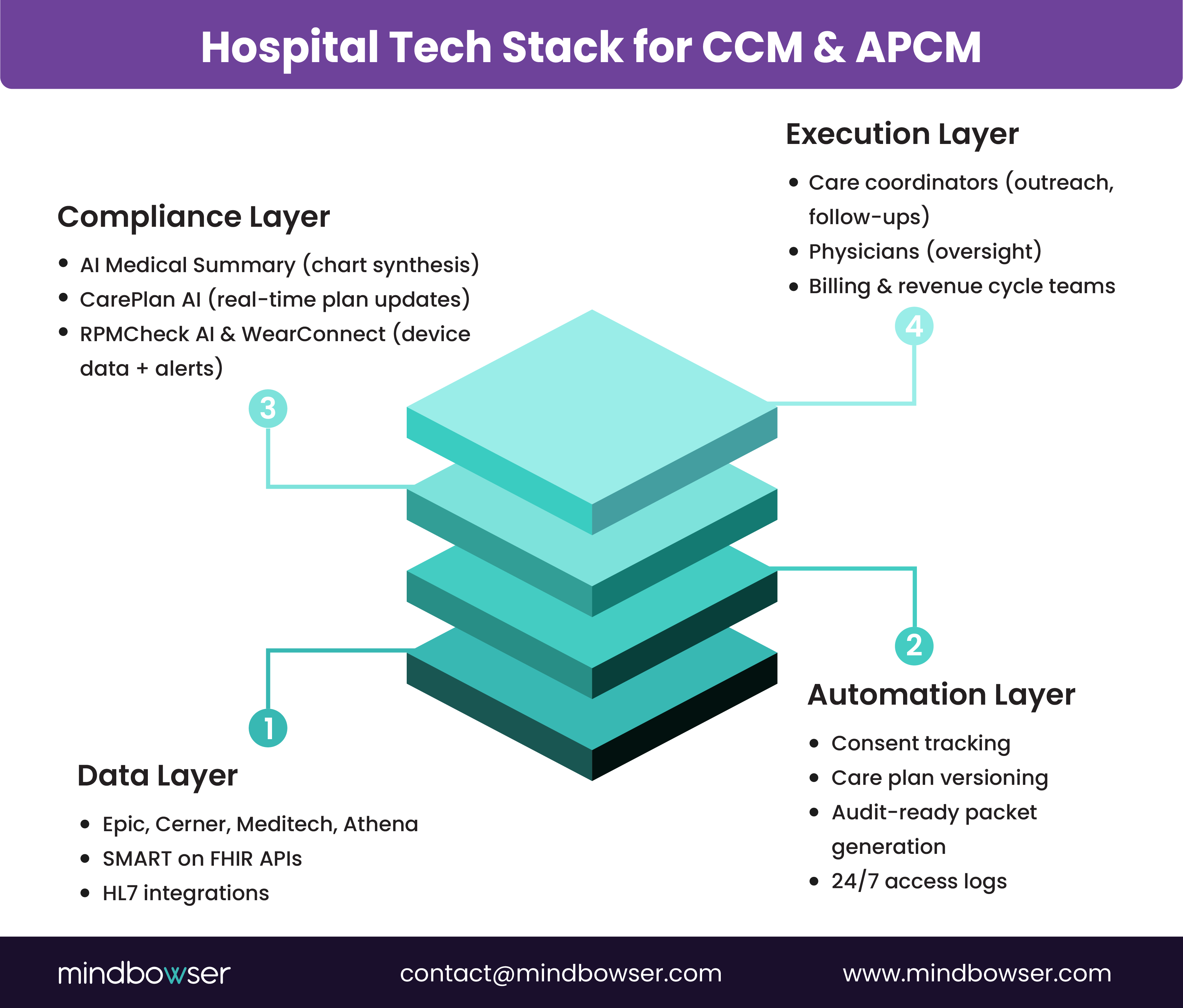 2. EHR Integration – Connect CCM platforms with Epic, Cerner, or Meditech using SMART-on-FHIR APIs to enable care plan write-backs, consent tracking, and packet assembly.
