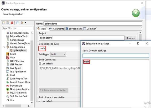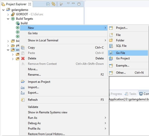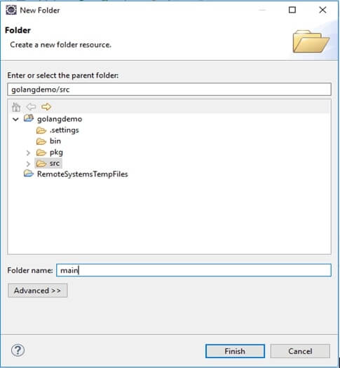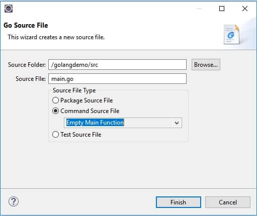 Here Enter your go file name with .go extension and choose the Command Source file option. The first option will create empty main functions and Simple Web Server option creates Simple Web Application.
