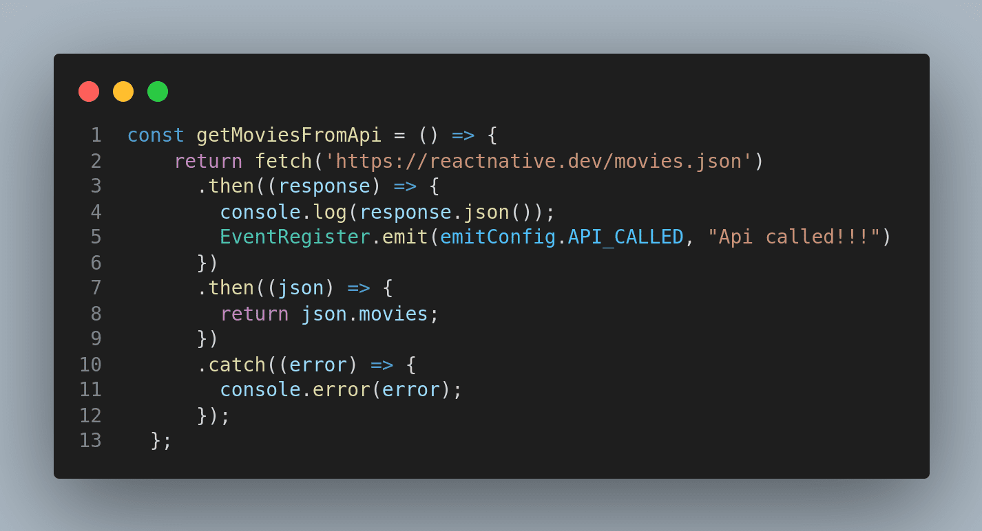 Let’s say we have called 1st API in file B using fetch. Fetching resources across the network are provided by fetch API. Fetch provides request and response objects. Once we get the success response we will emit the event like below,