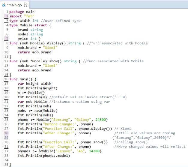 phone := Mobile{"Samsung", "Galaxy", 24500} //Struct initialization