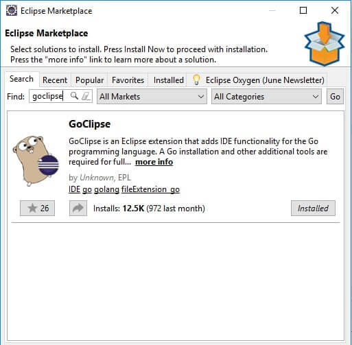 In the Eclipse , right click on Help Menu→ Eclipse Marketplace→ search for ‘Goclipse’ and install it.