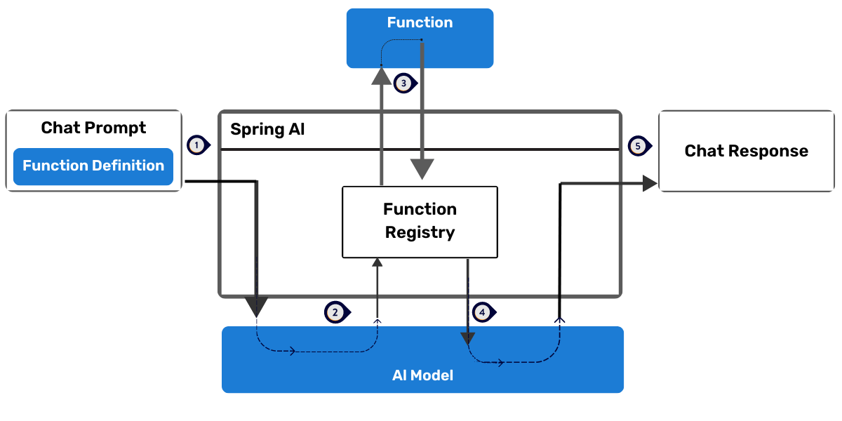 • Spring AI Integration: Spring AI simplifies function invocation, allowing you to register functions as @Bean and include the bean name in prompt options.