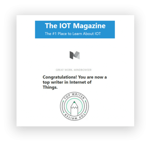 Mindbowser has two publications on Medium known as The IoT Magazine and Chatbots Journal. These two publications have a readership audience of 40k+ quarterly views and 2.3k+ followers. Writers can share articles on our two publications of about their experiences, opinions, and learnings in these two technologies. Both ‘IoT Magazine’ and ‘Chatbots Journal’ have been awarded as Top Writers in IoT and Chatbots Journal badge by Medium.