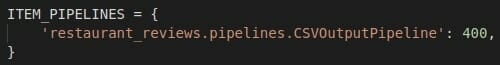 Step 4 => Now we will create a custom pipeline, in Scrapy to output data in 2 separate CSV files (Restaurants.csv & Reviews.csv). After creating the custom pipeline we will add it in ITEM_PIPELINES of Scrapy settings.py file.
