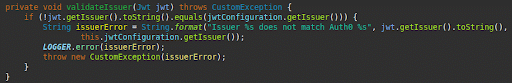 • Verifying the issuer: This method will check whether the issuer is the same. If someone uses a different token from a different issuer. This method will check the validator. However, If the issuer doesn’t match, then the request will be rejected in the backend.